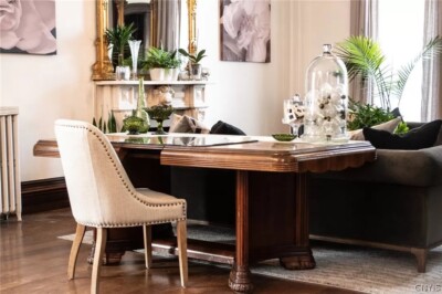 Step inside The Stillness Room, a soft and contemplative sanctuary nestled within this grand Victorian home. With its soaring high ceilings, gentle fireplace, and three tall windows that welcome in the quiet morning light, this room invites you to pause, breathe, and experience the rare gift of unhurried time. A tranquil waterfall offers a continuous whisper of calm, while lush, thriving plants cradle the space in living green.