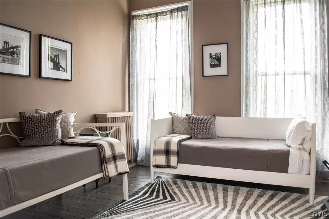 This serene king bedroom is the crown jewel of the Victorian home, a spacious, light-filled retreat anchored by a stunning oversized king bed dressed in soft, gathered linens that feel like a gentle embrace. The room glows with quiet elegance: textured wallpaper, curated artwork, and modern bedside lighting create a calming, grounded atmosphere perfect for deep rest and restoration.