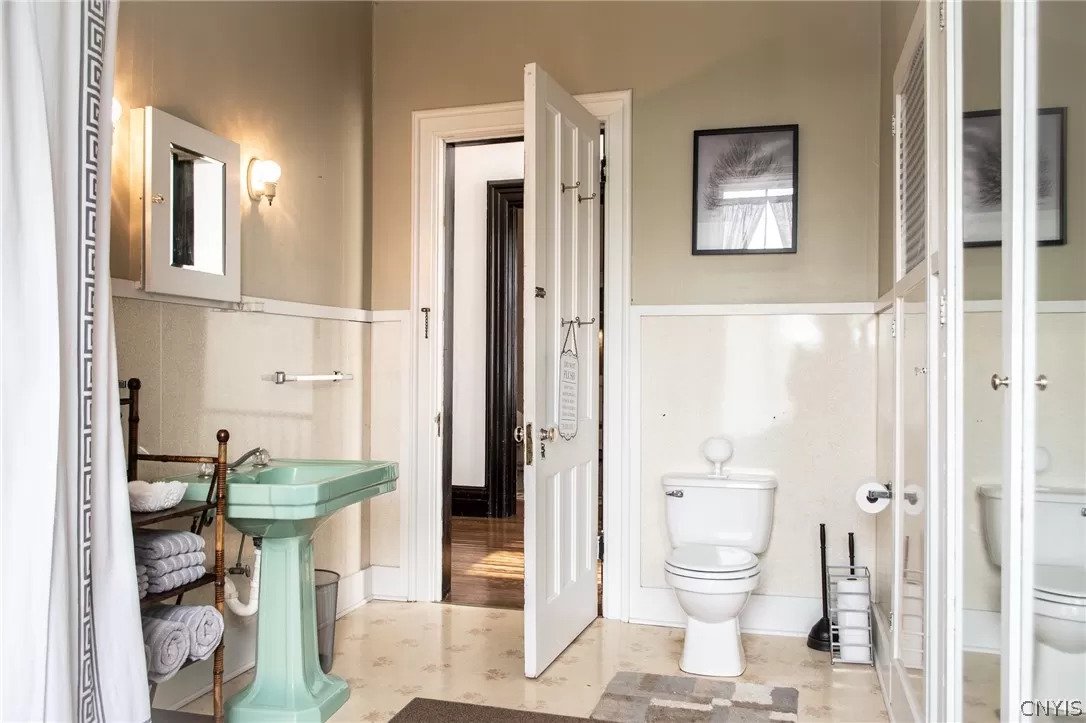 A tufted bench sits at the foot of the bed, perfect for journaling, stretching, or savoring a moment of stillness before the day begins. The original ceiling medallion and period woodwork offer a whisper of history, giving the space a quiet, irresistible allure. Soft textures, layered bedding, and thoughtful details create a cocoon-like atmosphere where the body unwinds and the mind softens.